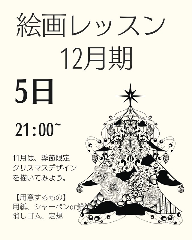 12月は、季節限定クリスマスの絵を描きましょう。 クリスマスに大切な人へのメッセージカードにも使えるデザイン、クリスマス気分が味わえるので一緒に楽しい時間を過ごしましょう。 ※メールが届かないと言うお客様がいらっしゃいます。購入時のメールアドレスはスマートフォン以外のメールアドレスで登録願います。PDF が送られて来ないとzoomのIDなどがお送りできません。 【細かくて美しいアートを学んでみませんか】 まるでレースのような美しい絵を自分の手で描けたら…そんな想いを実現できる講座のご案内です。 普通の絵とは一味違う、精密でエレガントな絵。でもご心配なく、特殊な教え方で誰でも絵を描けるようになります。 実際、現在オリジナルの絵を描いて切り絵にしている生徒たちも、作画経験がなかった方が多いです。しかし、特殊な手法で学び、自分だけの作品を作り出せるようになっていきました。 現在100人以上の生徒たちが、自分のスタイルで絵を描き、切り、毎年発表会を開催しています。 ただ、すべての人が切り絵までしたいわけではないでしょう。 しかし、このレースのような美しい絵を、一度自分の手で描いてみたいと思ったことはありませんか? この講座はそんなあなたにぴったりです。 【こんな使い方も】 • 細ペンで清書し、色をつけて飾る • カーボン紙を使って描いた絵柄をカードに写し描いてプレゼントする • グラスアート、グラスリッツェンの図案に使う • 自分で描いた図案を商品化して販売することも可能 あなたはどんな絵を描いてみたいですか? 【準備物】 • 絵を描く用紙 • 筆記用具 (シャーペンまたは鉛筆、消しゴム、物尺) 【注意事項】 • 講座の内容は転載、利用、商用禁止です。 • 著作権は、講座依頼先である蒼山日菜に屬します。 • 蒼山の体調不良や緊急事態の場合、講座の遅延または中止の可能性があります。 ご興味のある方は、ぜひご参加ください! ※受講日の1週間前後にアーカイブのメールをご登録いただいていますメールにお届けします。 1週間経ってもメールに届いていない場合、システム関連もしくは迷惑メールに届いている可能性が高いですが、お気軽にお問い合わせくださいませ。