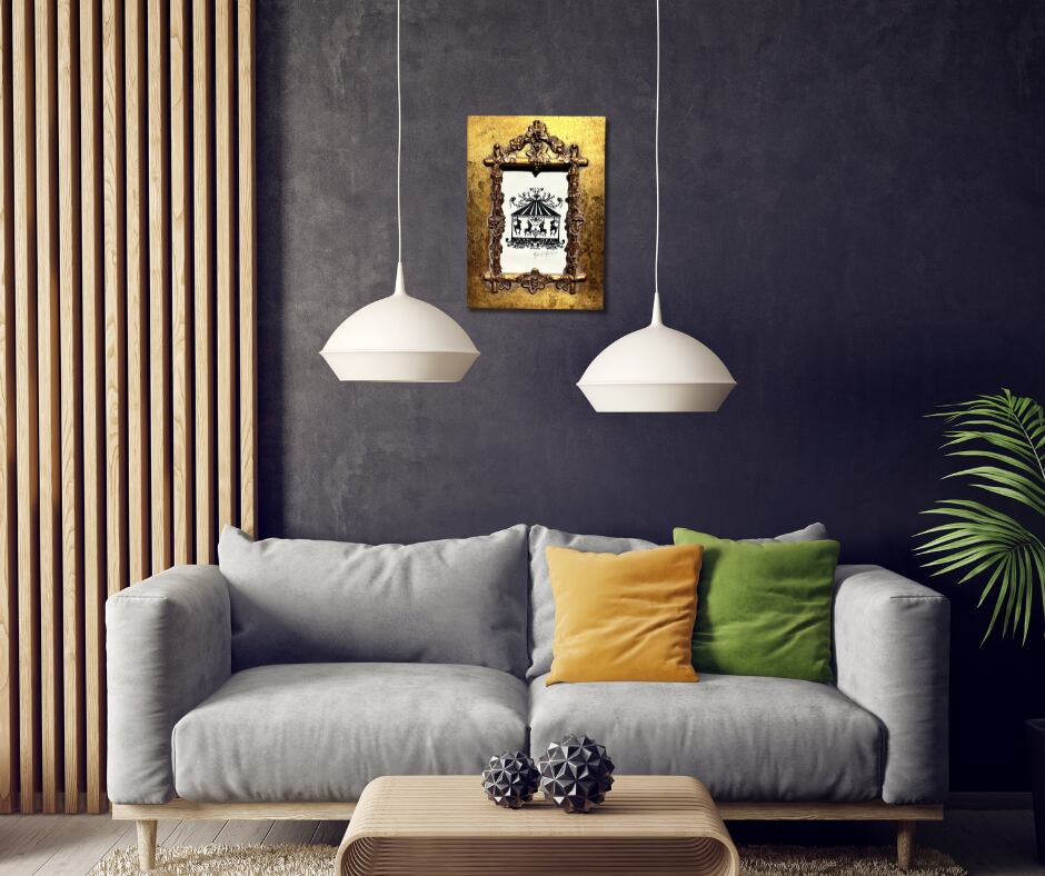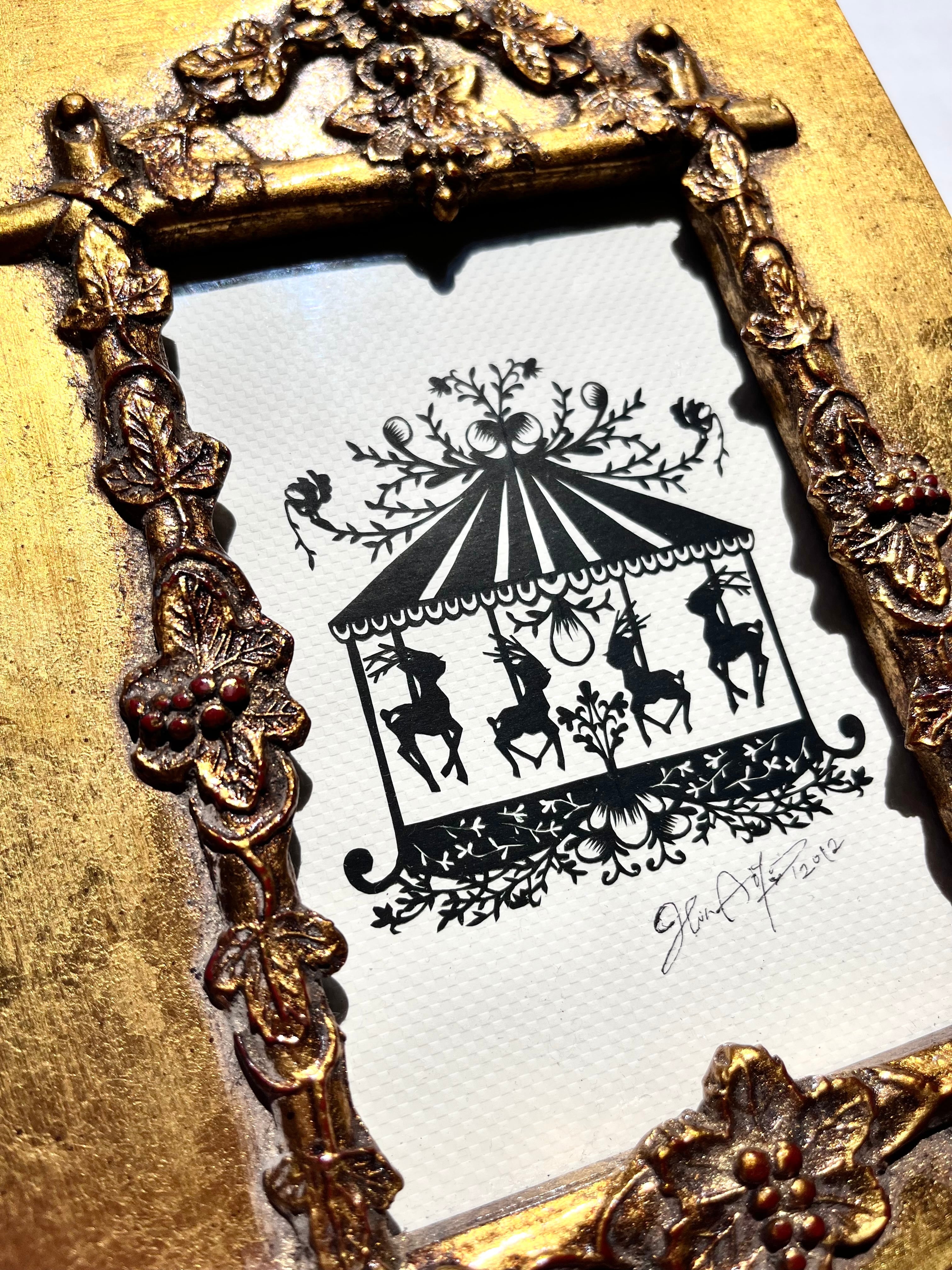 メリーゴーランドの幻想的な情景が優雅に表現され、見る者に夢の世界へと誘うような仕上がりとなっています。額装もゴージャスなのに、メリーゴーランドの切り絵がしっくりきます。