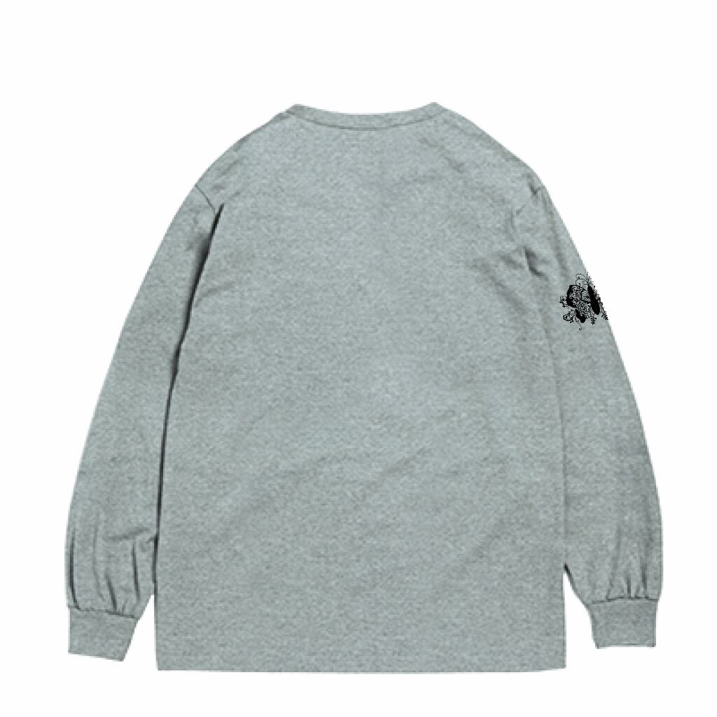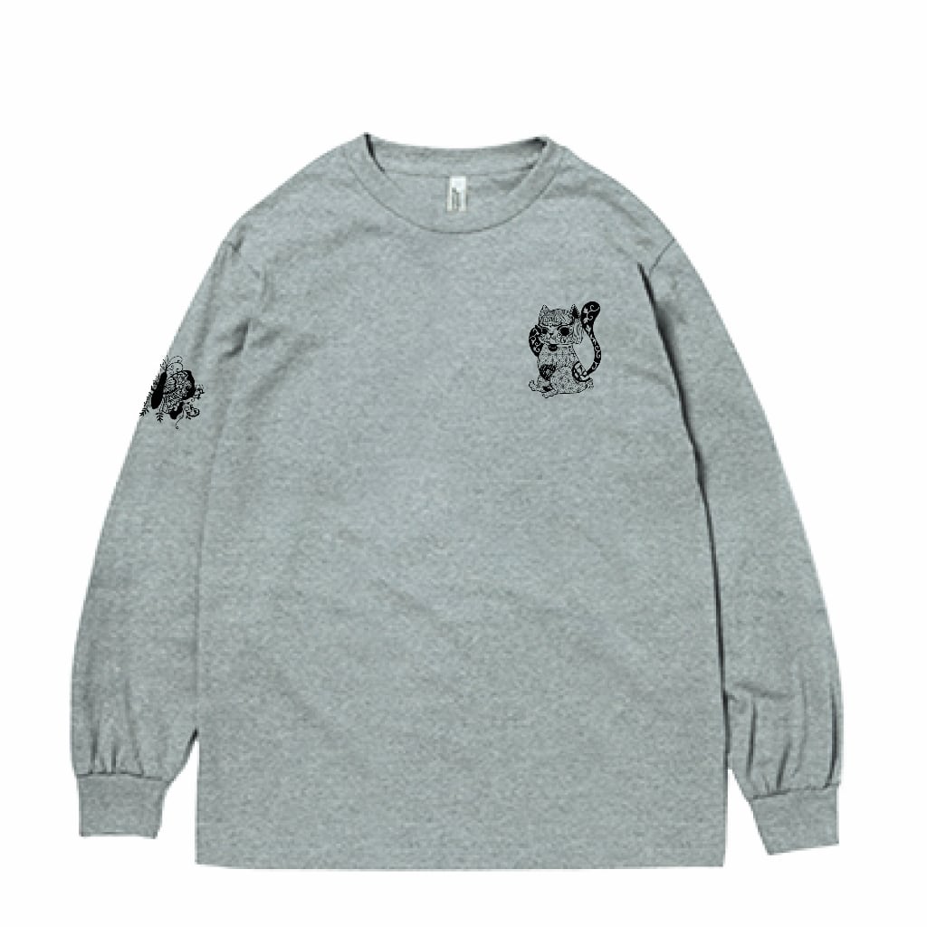 胸に招き猫、腕に幸運を運ぶ蝶をあしらったオリジナルデザインロングTシャツ サイズ:S,M,L,XL 色:ヘザーグレー